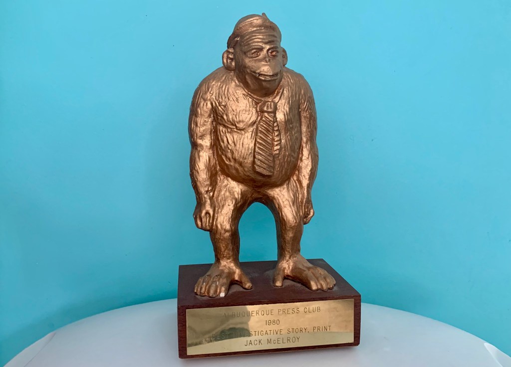 For many years, journalists who worked in Albuquerque cherished Albuquerque Press Club awards above many more prestigious prizes. The reason: The APE Awards were the coolest-looking trophies ever. A golden slouch-shouldered gorilla stood upon a wooden base wearing only a too-small fedora with a press card and a sloppily loosened tie, cigarette dangling from his lips.